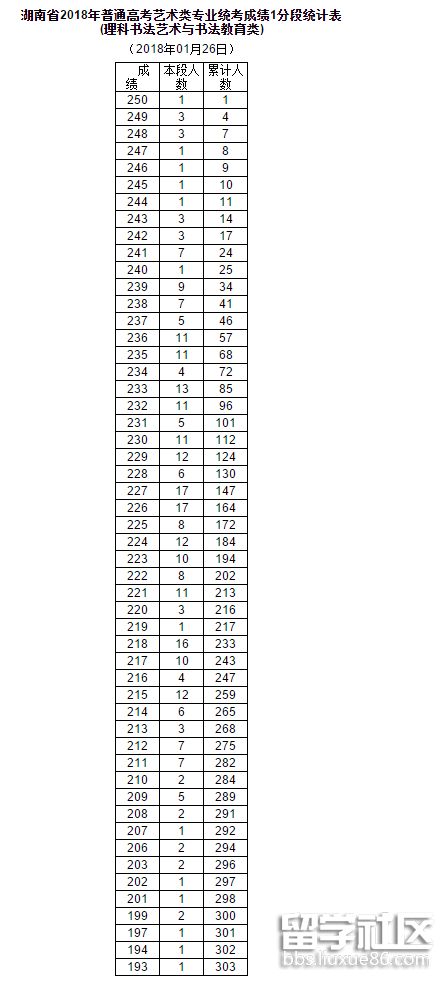 湖南2018書法藝術(shù)與書法教育類統(tǒng)考成績一分段統(tǒng)計表(理科)