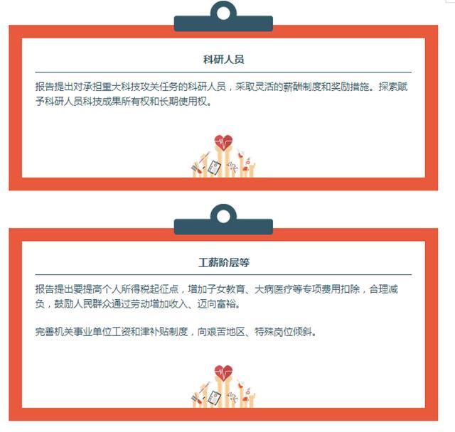 報(bào)告提出要提高個(gè)人所得稅起征點(diǎn),增加子女教育、大病醫(yī)療等專項(xiàng)費(fèi)用扣除,合理減負(fù),鼓勵(lì)人民群眾通過勞動(dòng)增加收入、邁向富裕。