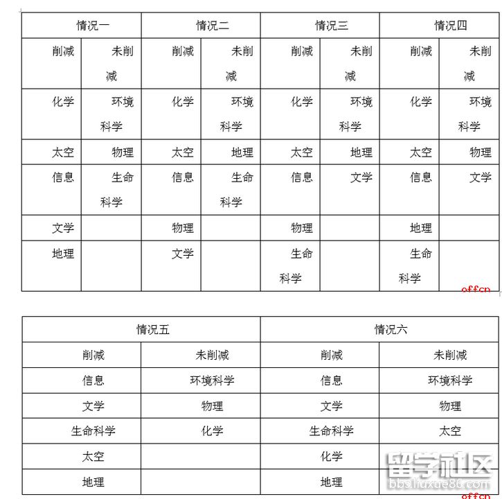 情況五&六:第五種情況第六種情況:都是信息學被削減,物理不被削減的情況,那么,此時,化學和太空就是可能被削減的部分,如表所示。