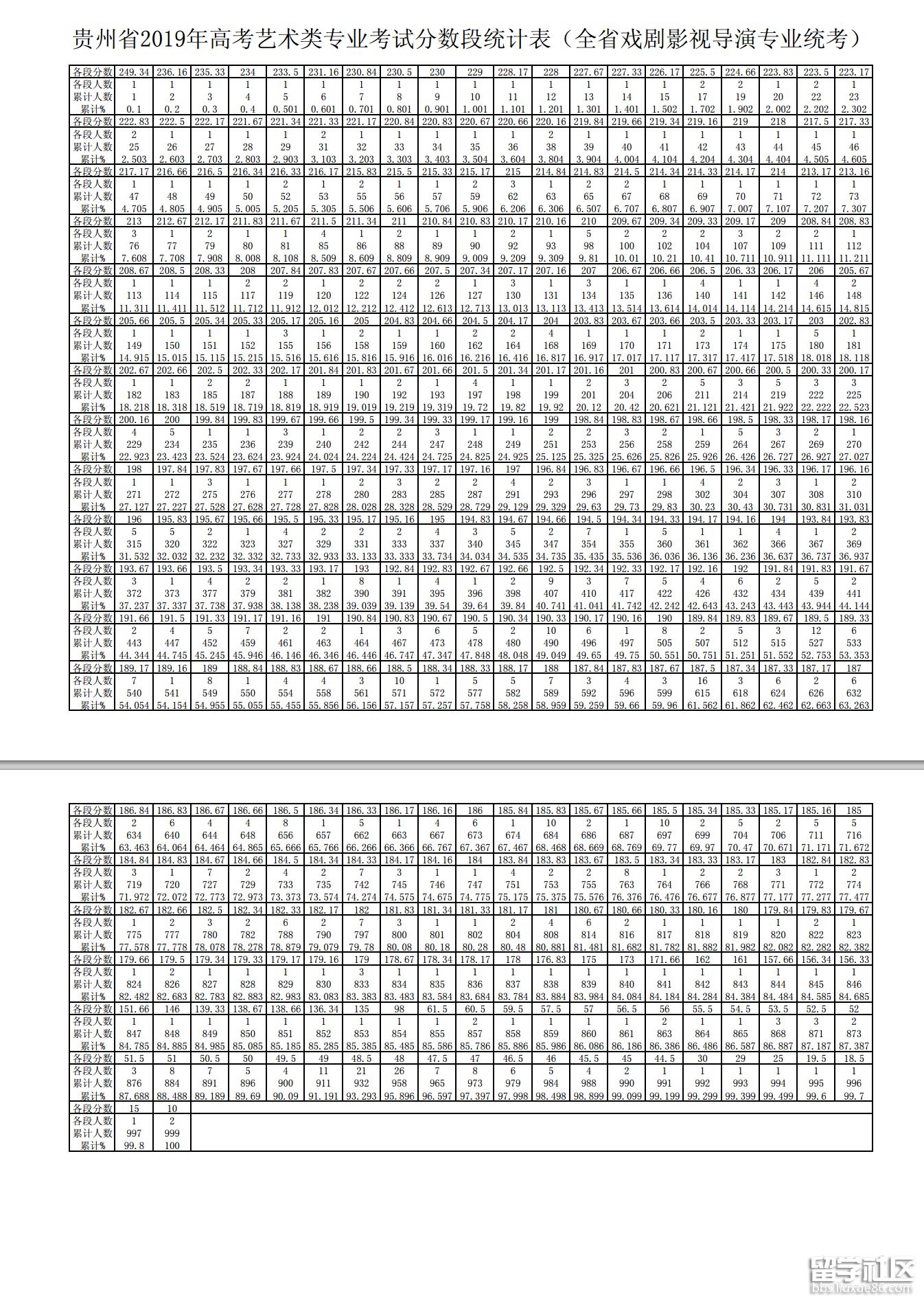 貴州2019高考藝術類專業(yè)考試分數段統(tǒng)計表(全戲劇影視導演專業(yè)統(tǒng)考)