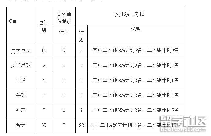 招生項目:足球(男、女)、田徑、手球(女,組織后衛(wèi)、守門員優(yōu)先)、射擊(僅招收男女氣步槍、男女氣手槍項目)。計劃招生人數(shù):35名,根據(jù)文化課考試類型要求,分為文化單獨考試和文化統(tǒng)一考試兩大類別。其中文化單獨考試類為一級及以上運動員報考,計劃為7名;文化統(tǒng)一考試類為二級及以上運動員報考,計劃為28名。考生根據(jù)自身情況選擇其中一個類別報考。具體各類別招生項目和計劃如下: