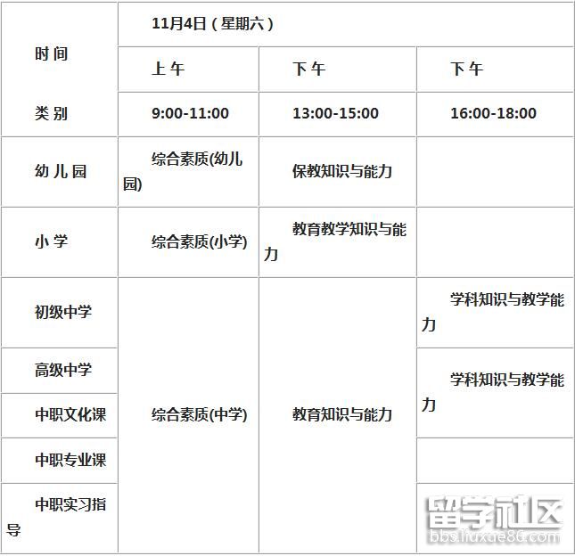 根據(jù)《2017下半年四川教師資格證考試通知》可知2017下半年四川教師資格證考試筆試時間安排表: