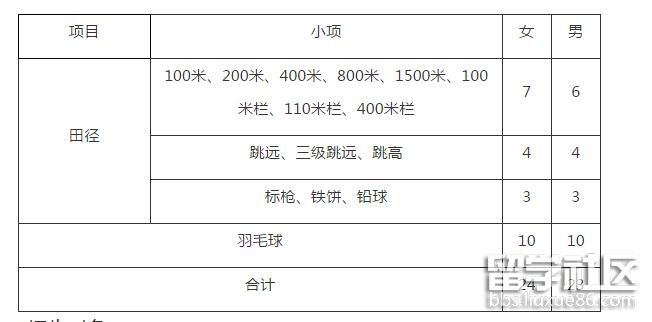 1.招生項目:羽毛球、田徑(100米、200米、400米、800米、1500米、100米欄、110米欄、400米欄、跳高、跳遠、三級跳遠、鉛球、鐵餅、標槍)
