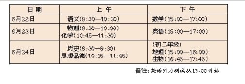 根據(jù)全省統(tǒng)一組織實(shí)施中考工作安排,初二年級(jí)地理、生物學(xué)業(yè)考試定于6月24日下午舉行,初中畢業(yè)班學(xué)生畢業(yè)、升學(xué)考試定于6月22日-6月24日上午舉行,具體安排詳見(jiàn)下表。