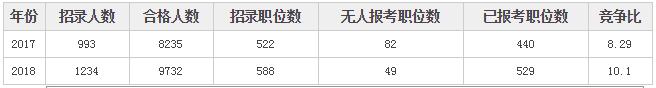 截至11月02日16時,據(jù)統(tǒng)計,2017國考與2018國考同期相比合格人數(shù)有明顯增長,增長1497人。其中共有49個職位無人通過審核,平均競爭比例為10.1:1。