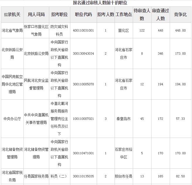 報名通過審核人數(shù)前十的職位主要集中在河北省氣象局、北京鐵路公安局、中國民用航空局華北地區(qū)管理局等部門,具體信息如下:
