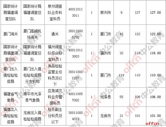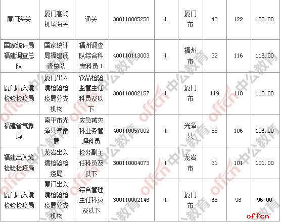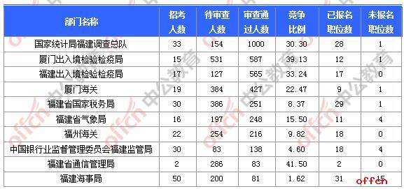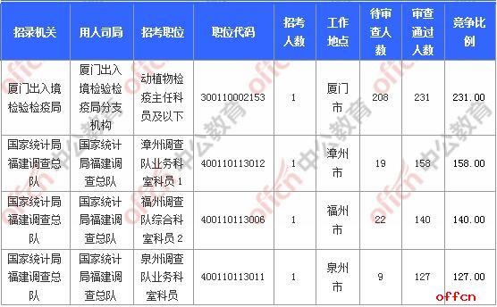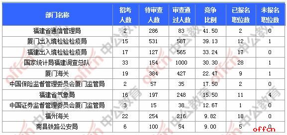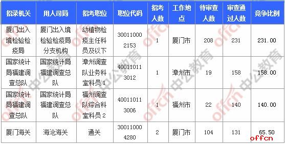 報名通過審核人數(shù)前十的職位主要集中在廈門出入境檢驗檢疫局、國家統(tǒng)計局福建調(diào)查總隊、廈門海關(guān)等部門,具體信息如下: