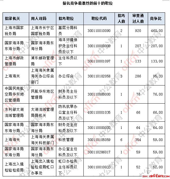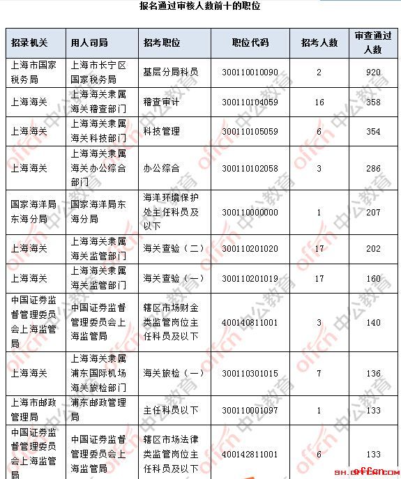 截止到2日16時(shí),競爭比例最高的職位為上海市國家稅務(wù)局上海市長寧區(qū)國家稅務(wù)局基層分局科員一職,招錄2人,截止到2日16時(shí)通過人數(shù)為920人。國考各崗位歷年工資待遇資訊群306289279報(bào)名通過審核人數(shù)前十的職位主要集中在上海市國家稅務(wù)局,上海海關(guān)等部門,具體信息如下: