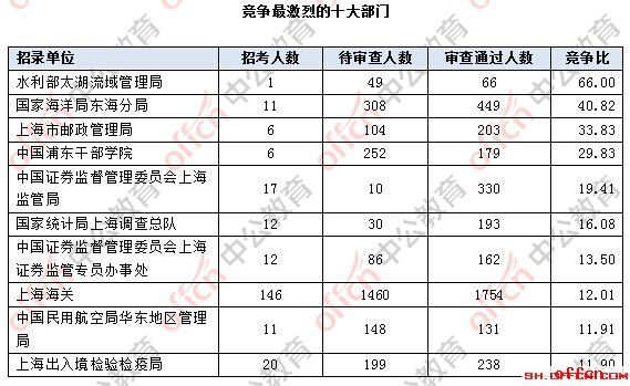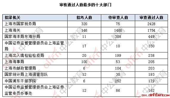 截止到2日16時(shí),通過審核人數(shù)前三位的部門依次是:上海市國家稅務(wù)局,上海海關(guān),國家海洋局東海分局,三部門通過審核總?cè)藬?shù)達(dá)4631人,占通過審核總?cè)藬?shù)的70.63%。