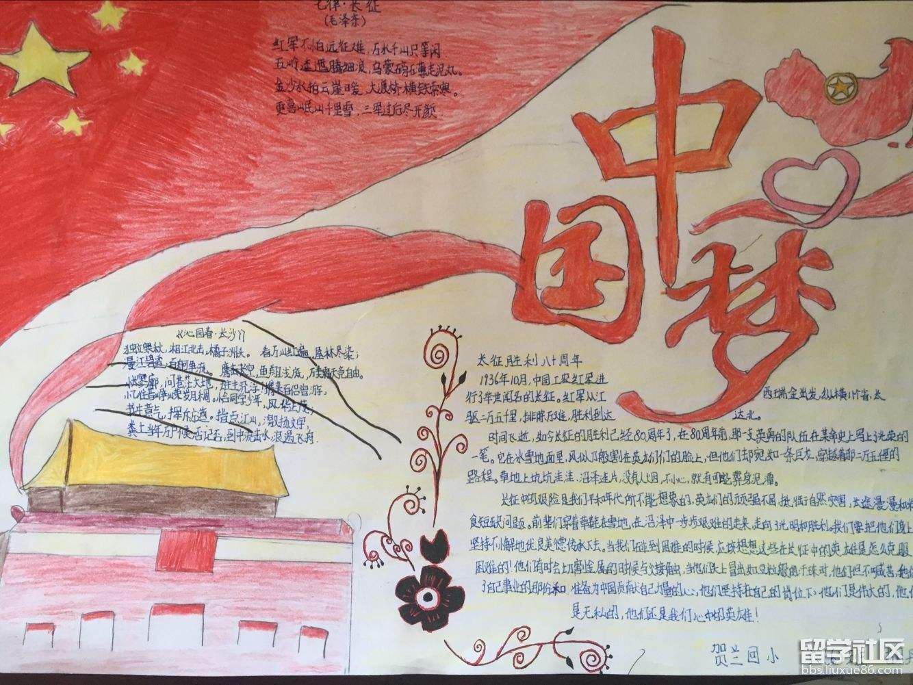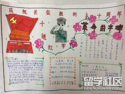 1934年10月,第五次反圍剿失敗后,中央主力紅軍為擺脫國民黨軍隊(duì)的包圍追擊,被迫實(shí)行轉(zhuǎn)移,退出中央根據(jù)地,進(jìn)行長征。1936年10月,紅軍三大主力在甘肅會(huì)寧地區(qū)會(huì)師,紅軍二萬五千里長征勝利結(jié)束。今年是紅軍長征的81周年,雖然戰(zhàn)爭已經(jīng)不在,但是精神還在。下面出國留學(xué)網(wǎng)小編為大家?guī)砹思t軍長征勝利81周年手抄報(bào)設(shè)計(jì),僅供參考謝謝閱讀,喜歡我們網(wǎng)站的朋友可以關(guān)注一下。