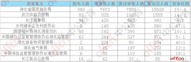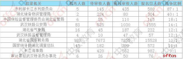 截止到11月2日16時,報名人數排名前三位的部門依次是:湖北省國家稅務局、武漢鐵路公安局、長江海事局,三部門通過審核總人數達9447人,占通過審核總人數的84.7%。