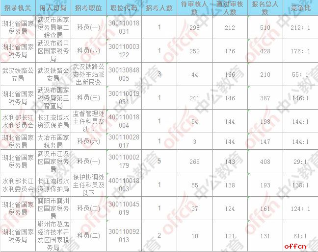 報名通過審核人數前十的職位主要集中在湖北省國家稅務局、武漢鐵路公安局等部門,具體信息如下:
