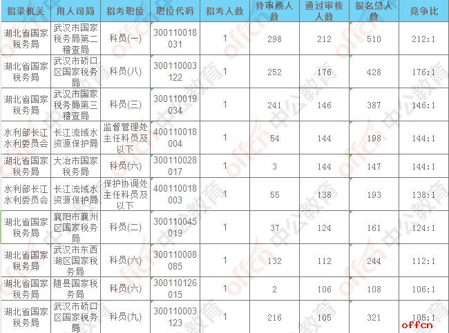 截止到2日16時,競爭比例最高的職位為武漢市國家稅務局第二稽查局科員(一)一職,招錄1人,截止到2日16時通過人數為212人。