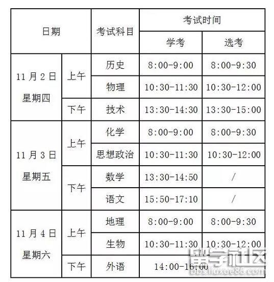 考試歷時三天,共十個場次。學(xué)考時長60分鐘(其中語文、數(shù)學(xué)學(xué)考時長80分鐘),選考時長90分鐘,外語考試時長120分鐘。具體安排見下表。