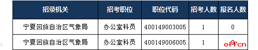 截止到11月3日16時(shí),工作地點(diǎn)在寧夏的職位共有2個(gè)無(wú)人報(bào)考,占全部職位的2%。下面是無(wú)人報(bào)考職位一覽表,建議廣大考生多關(guān)注一些較冷職位,避免激烈競(jìng)爭(zhēng),結(jié)合自身?xiàng)l件,找到屬于自己的最佳職位。