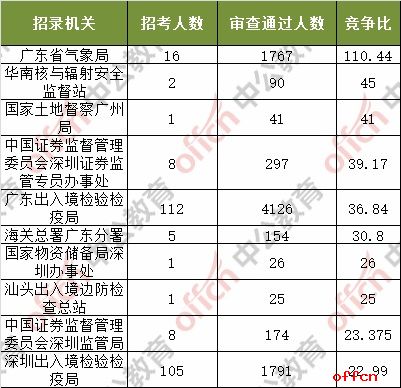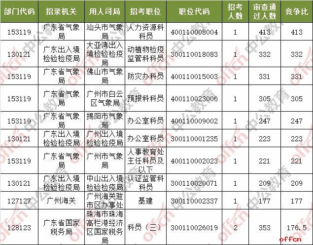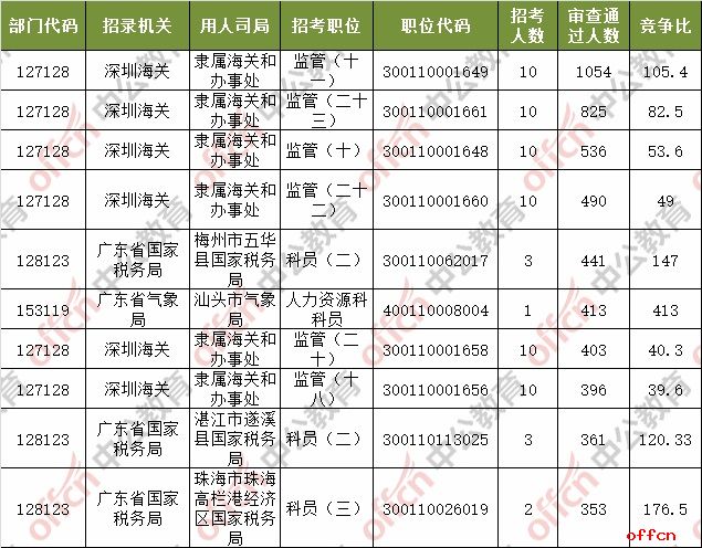 報(bào)名通過(guò)審核人數(shù)前十的職位主要集中在深圳海關(guān)、廣東省國(guó)家稅務(wù)局、廣東省氣象局等部門(mén),具體信息如下: