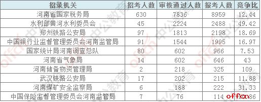 報名通過審核人數(shù)前十的職位主要集中在鄭州鐵路公安局、河南省氣象局、河南省國家稅務局,具體信息如下: