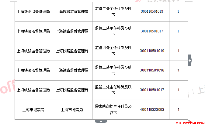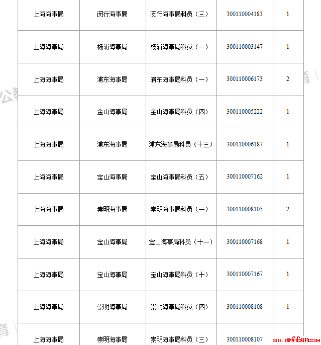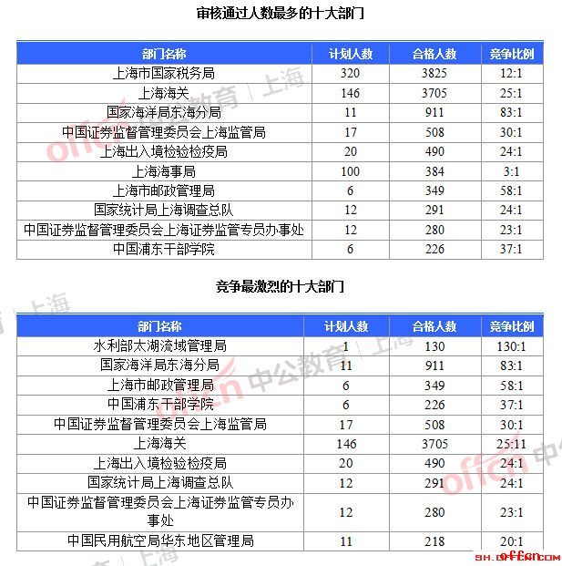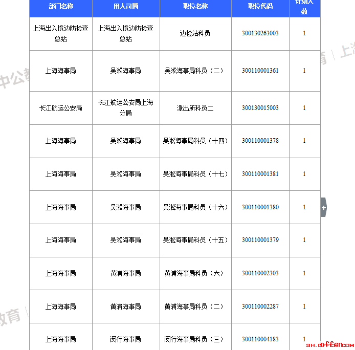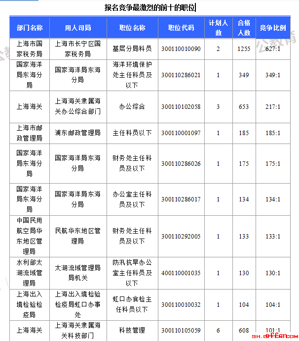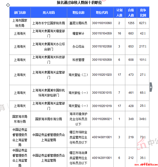 報名通過審核人數(shù)前十的職位主要集中在上海市國家稅務(wù)局、上海海關(guān)、國家海洋局東海分局等部門,具體信息如下: