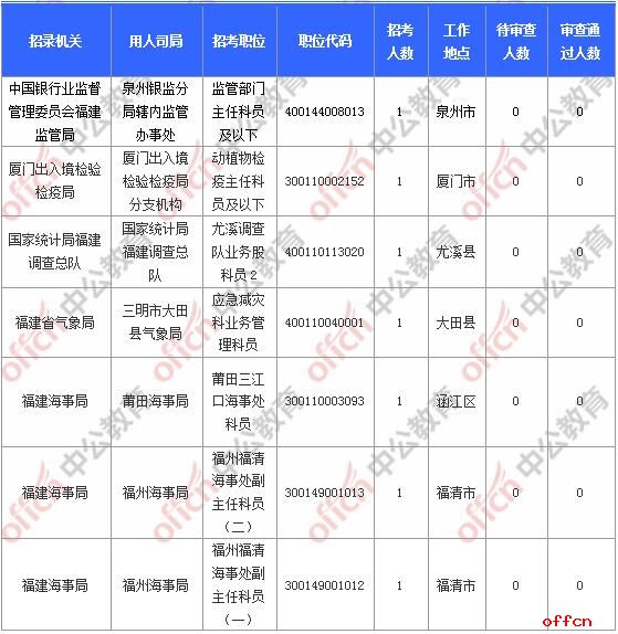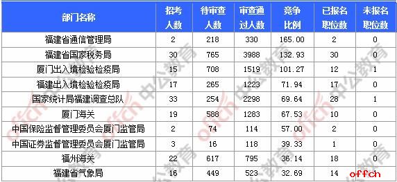 報(bào)名通過審核人數(shù)前十的職位主要集中在福建省國家稅務(wù)局、廈門出入境檢驗(yàn)檢疫局、廈門海關(guān),具體信息如下: