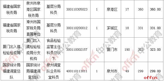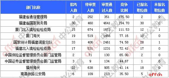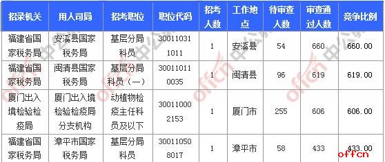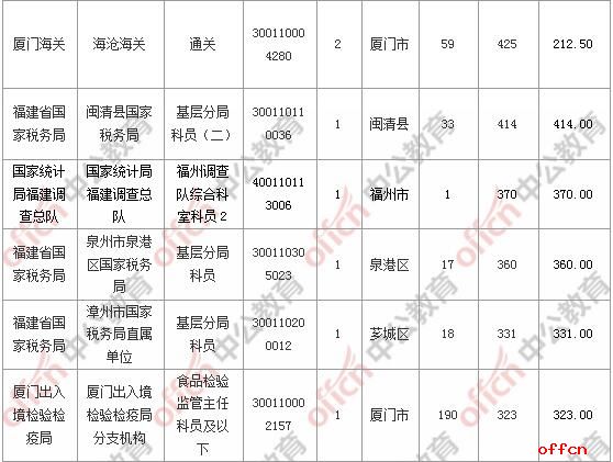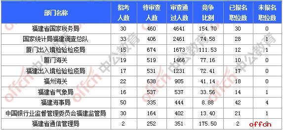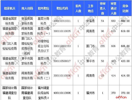 報名通過審核人數(shù)前十的職位主要集中在福建省國家稅務(wù)局、廈門出入境檢驗檢疫局、廈門海關(guān),具體信息如下: