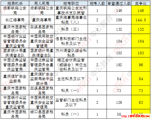 報(bào)名通過(guò)審核人數(shù)前十的職位主要集中在成都鐵路公安局、長(zhǎng)江海事局、中國(guó)證券監(jiān)督管理委員會(huì)重慶監(jiān)管局、重慶市國(guó)家稅務(wù)局四個(gè)部門,報(bào)名通過(guò)審核人數(shù)最多的職位亦是競(jìng)爭(zhēng)比例最高的職位。報(bào)名通過(guò)人數(shù)位居第二的長(zhǎng)江海事局重慶海事局重慶海事局海事處科員(八)一職,是前幾天占競(jìng)爭(zhēng)比例鰲頭的職位,該職位對(duì)基層工作最低年限為3年,主要招考為已步入社會(huì)工作的人員,對(duì)學(xué)位、政治面貌、服務(wù)基層項(xiàng)目工作經(jīng)歷無(wú)限制。錄用后兼任海巡艇船員,簽訂5年期服務(wù)協(xié)議,服從調(diào)配,由此看來(lái),具有吃苦精神的大有人在。