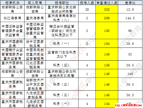 截止到6日16時(shí),通過(guò)審核人數(shù)前三位的部門依次還是:重慶市國(guó)家稅務(wù)局、中國(guó)銀行業(yè)監(jiān)督管理委員會(huì)重慶監(jiān)管局、成都鐵路公安局,三部門通過(guò)審核總?cè)藬?shù)達(dá)8281人,占通過(guò)審核總?cè)藬?shù)的86%。