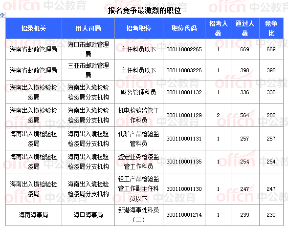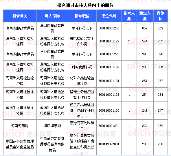 報(bào)名通過(guò)審核人數(shù)前十的職位主要集中在海南省郵政管理局、海南出入境檢驗(yàn)檢疫局、海南海事局等部門,具體信息如下: