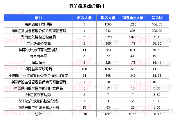 截至11月8日16時(shí),據(jù)統(tǒng)計(jì),國(guó)考職位中工作地點(diǎn)在海南的職位通過(guò)審核總?cè)藬?shù)為6758人,共有4個(gè)職位無(wú)人通過(guò)審核,其中還有部分待審核的人數(shù)高達(dá)1064人,平均競(jìng)爭(zhēng)比例為28.16:1。