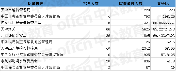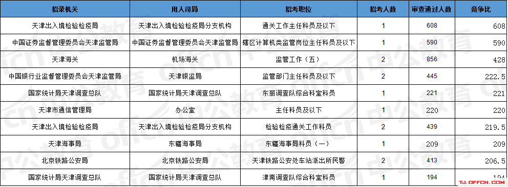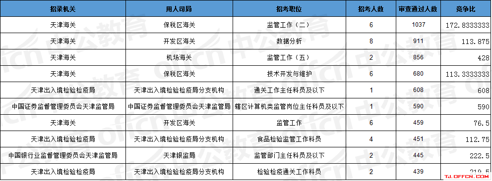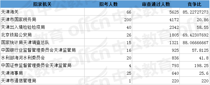 報名通過審核人數(shù)前十的職位主要集中在天津海關(guān)、北京鐵路公安局、天津出入境檢驗檢疫局等部門,具體信息如下: