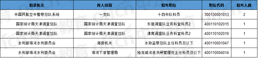 截止到8日17:30時,工作地點在天津的職位共有5個無人報考,占全部職位的2.4%。下圖是無人報考職位一覽表,建議廣大考生多關(guān)注一些較冷職位,避免激烈競爭,結(jié)合自身條件,找到屬于自己的最佳職位。
