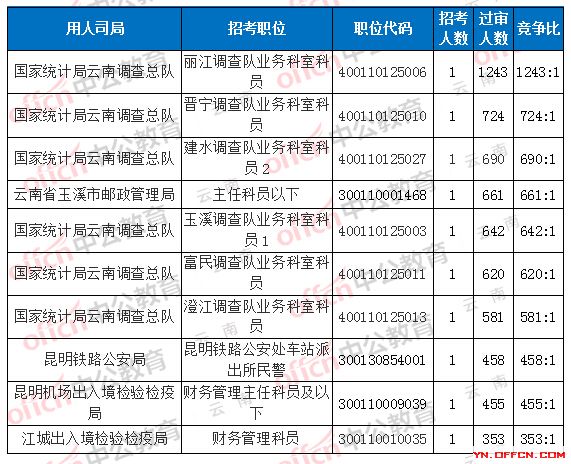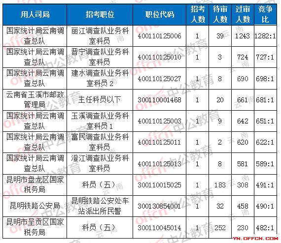 截止報名結束前最受歡迎的崗位是國家統(tǒng)計局云南調查總隊,麗江調查隊業(yè)務科室科員,職位代碼:400110125006,招錄1人,1282人報名,其中39人待審核通過,詳情如下圖: