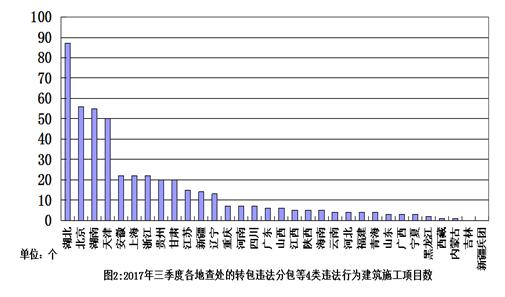 從查處的轉(zhuǎn)包、違法分包等4類違法行為看,湖北、北京、湖南3省(市)查處項(xiàng)目相對(duì)較多(見圖2)。