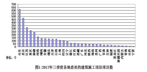 從各地查處的違法工程項(xiàng)目數(shù)量看,山東、北京、江蘇3省(市)查處力度較大,分別查處項(xiàng)目621個(gè)、472個(gè)、317個(gè)(見圖1)。