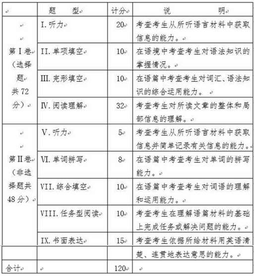 試卷題型、計(jì)分和說(shuō)明如下: