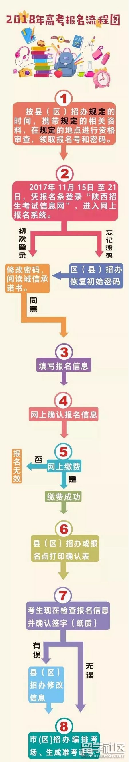 所有擬參加2018年普通高校招生錄取者必須按時網(wǎng)上報名、繳費和現(xiàn)場確認。凡未按時報名、未按時確認提交報名信息、未按時繳費、未按時簽字確認報名信息、未按系統(tǒng)所列項目和要求報名的,其后果由本人承擔。網(wǎng)上報名和網(wǎng)上繳費時間為2017年11月15日-21日,11月25日前,確認報名信息。