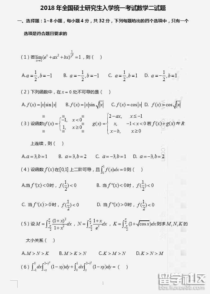 2018考研數(shù)學(xué)二真題已公布