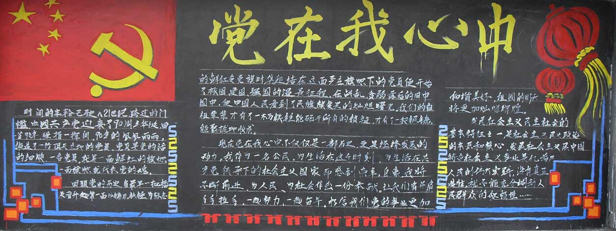 黨黨在我心中黑板報(bào)歲了,我們?yōu)辄h的歷史之久而高興,更為黨在**歲之際,依然干勁十足,依然蓬勃向上,依然前途無(wú)量而自豪。