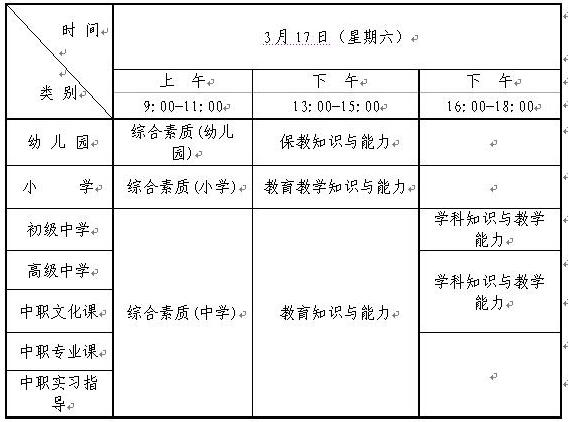 1、全國中小學(xué)教師資格考試日期為2018年3月17日,具體時(shí)間安排如下:
