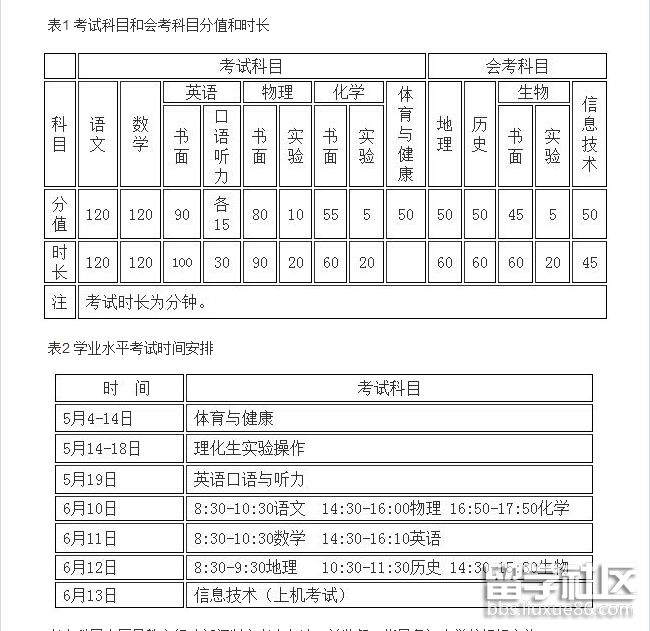 考試科目和會考科目具體考試安排如下(表1、表2):