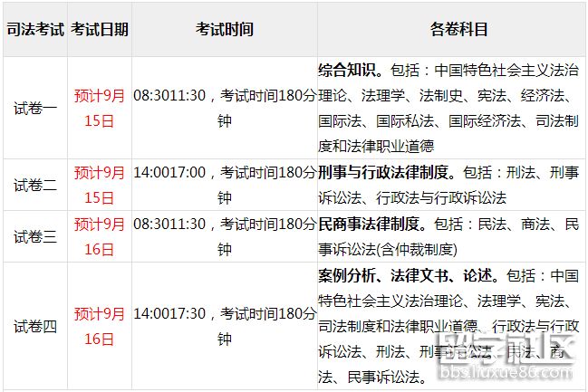 2018年國家司法考試時間尚未公布,根據(jù)《國家職業(yè)資格目錄》可知,2018年國家司法考試將迎來改革,考試名稱將從“國家司法考試”改為“法律職業(yè)資格考試”,其他改革內(nèi)容尚未可知。具體的考試時間可先參考2017年的: