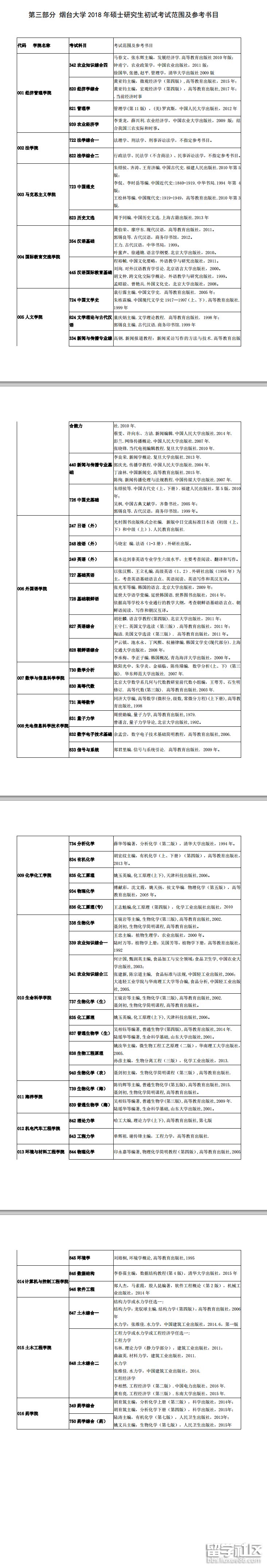 煙臺大學(xué)2018考研初試考試范圍及參考書目