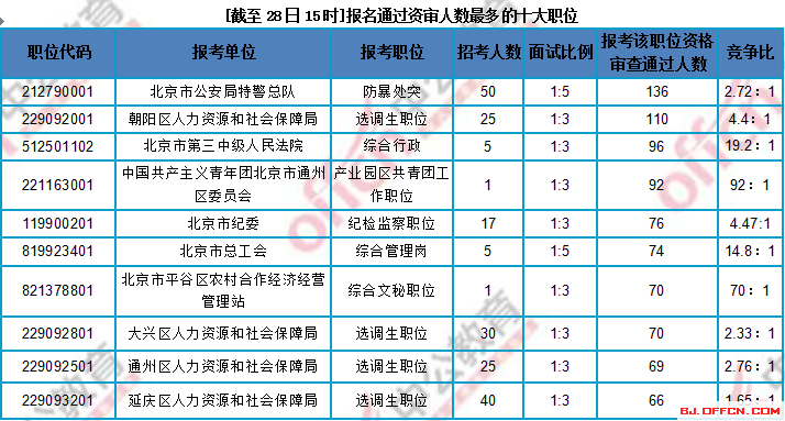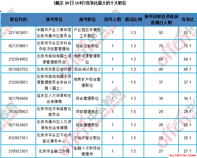 截止到28日15時(shí),競(jìng)爭(zhēng)比最高的職位為中國(guó)共產(chǎn)主義青年團(tuán)北京市通州區(qū)委員會(huì)的產(chǎn)業(yè)園區(qū)共青團(tuán)工作職位,招錄1人,目前報(bào)考該職位通過資審的有92人。競(jìng)爭(zhēng)較激烈的十大職位主要有中國(guó)共產(chǎn)主義青年團(tuán)北京市通州區(qū)委員會(huì)的產(chǎn)業(yè)園區(qū)共青團(tuán)工作職位、北京市平谷區(qū)農(nóng)村合作經(jīng)濟(jì)經(jīng)營(yíng)管理站綜合文秘職位、北京市規(guī)劃和國(guó)土資源管理委員會(huì)地質(zhì)資源管理職位等,可以看出來(lái)報(bào)名第二天競(jìng)爭(zhēng)比最大的職位與第一天有很大的不同,具體信息如下: