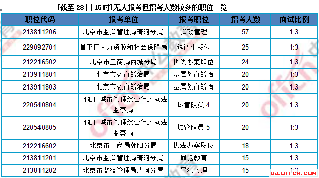 下面是截止到今日15時(shí)京考全部無(wú)人報(bào)考職位中招考人數(shù)較多的部分職位一覽表,在此中公教育專家建議在報(bào)考時(shí)一定注意職位的具體要求,結(jié)合自身?xiàng)l件,找到屬于自己的最佳職位。