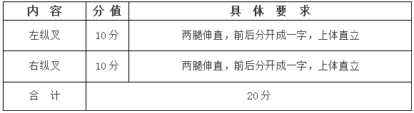 (1)左右豎叉(20分):姿態(tài)端正,兩腿伸直分開成一字,腿及髖部全部著地、髖位正,膝關(guān)節(jié)伸直。男生髖關(guān)節(jié)最下沿離地每2cm扣1分,女生髖關(guān)節(jié)最下沿離地每1cm扣1分,直至扣完。