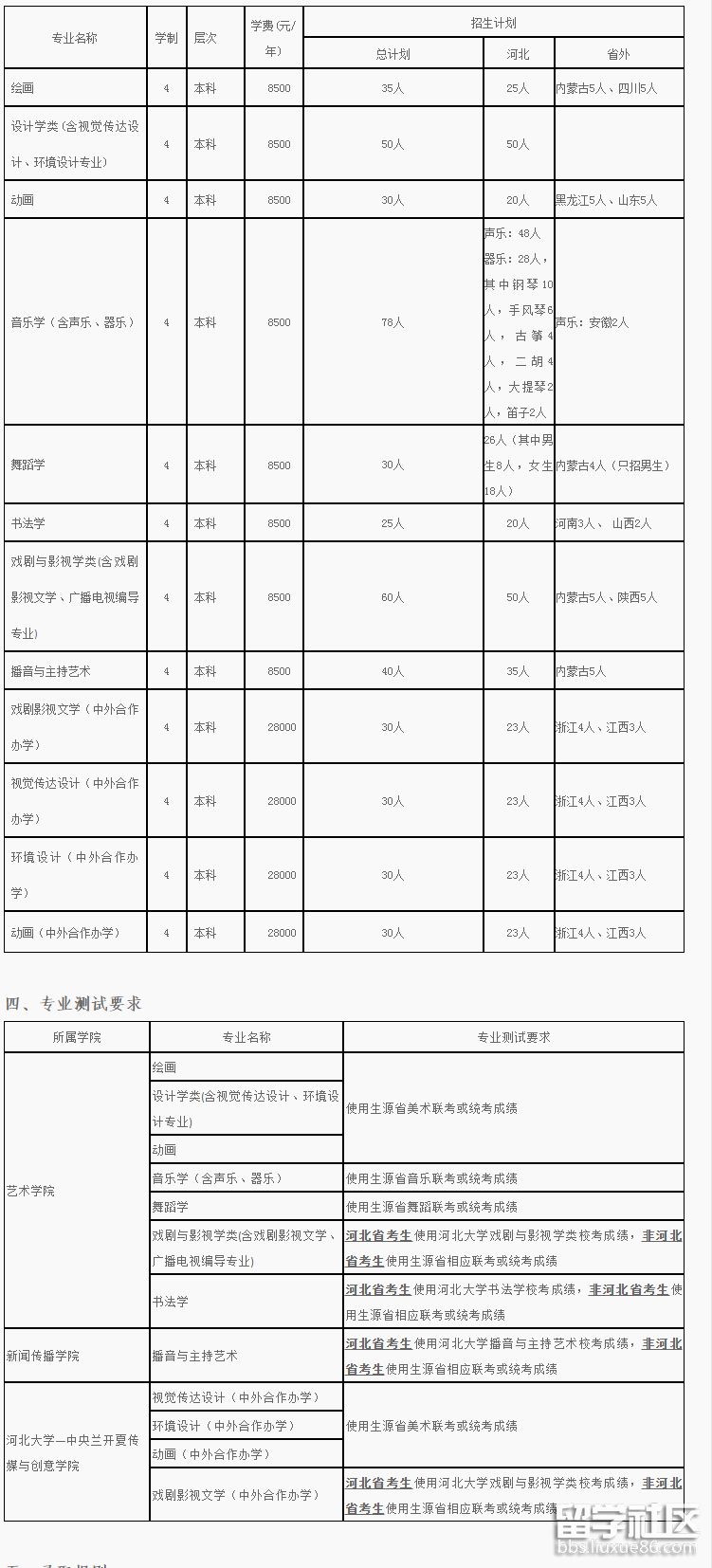 戲劇與影視學(xué)類(含戲劇影視文學(xué)專業(yè)、廣播電視編導(dǎo)專業(yè))、播音與主持藝術(shù)專業(yè)、書法學(xué)專業(yè)測試河北省考生采用河北大學(xué)校考成績、非河北省考生采用生源省相應(yīng)的藝術(shù)聯(lián)考(或統(tǒng)考)成績。
