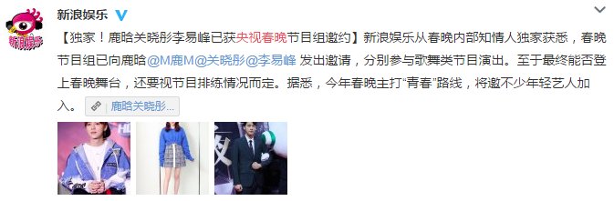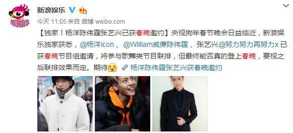 除此之外也有報(bào)道稱(chēng)楊洋陳偉霆張藝興也獲春晚邀約