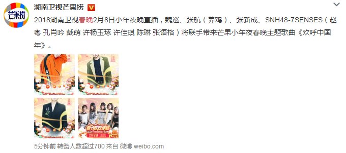 與央視春晚的猜測(cè)不同,湖南衛(wèi)視已經(jīng)逐步公布了小年夜春晚的名單。2018湖南衛(wèi)視春晚2月8日小年夜晚直播魏巡、張航(養(yǎng)雞)、張新成、SNH48-7SENSES將聯(lián)手帶來(lái)芒果小年夜春晚主題歌曲《歡呼中國(guó)年》。