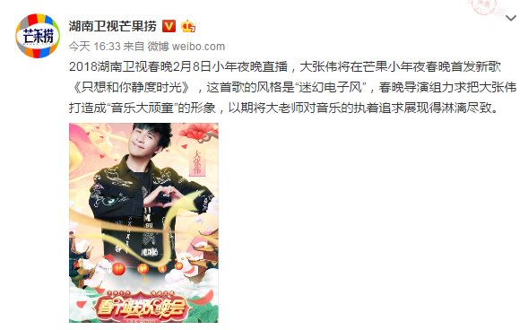 大張偉將在芒果小年夜春晚首發(fā)新歌《只想和你靜度時(shí)光》
