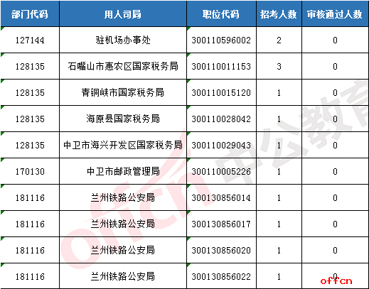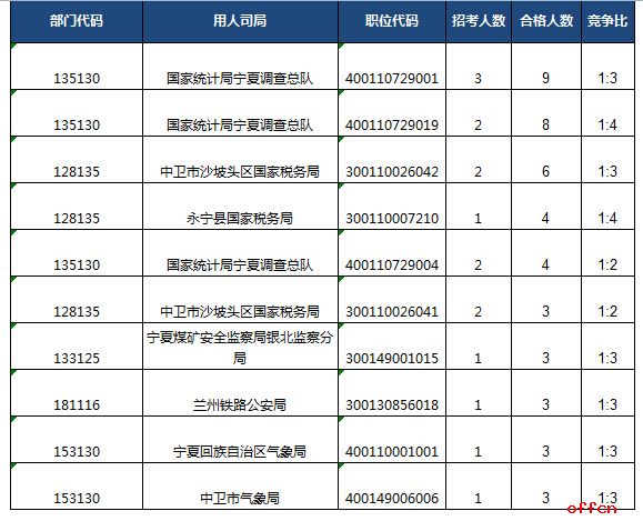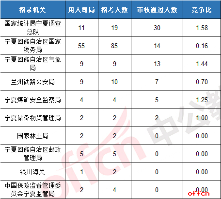 截止到30日18時,報名通過審核人數(shù)前十的職位主要集中在國家統(tǒng)計局寧夏調(diào)查總隊等部門,具體信息如下: