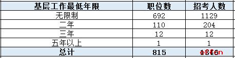 在這次國考職位表中,我們發(fā)現湖北地區(qū)職位高達84%的職位是對無工作經驗的應屆畢業(yè)生開放的,工作經驗限制較少。據統(tǒng)計,大部分崗位不限制工作經驗,其人數高達1129人。限制兩年基層工作經驗的僅有204人。其他限制合計13人??傮w上說對工作經驗限制的要求較松。因此,在就業(yè)難的今天,廣大應屆畢業(yè)生更是要根據自己實際情況,利用這次工作經驗限制松動的契機,通過公務員考試找到一份穩(wěn)定的工作。